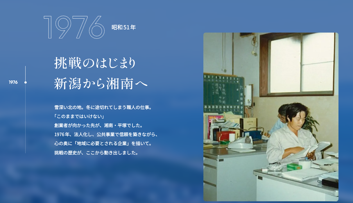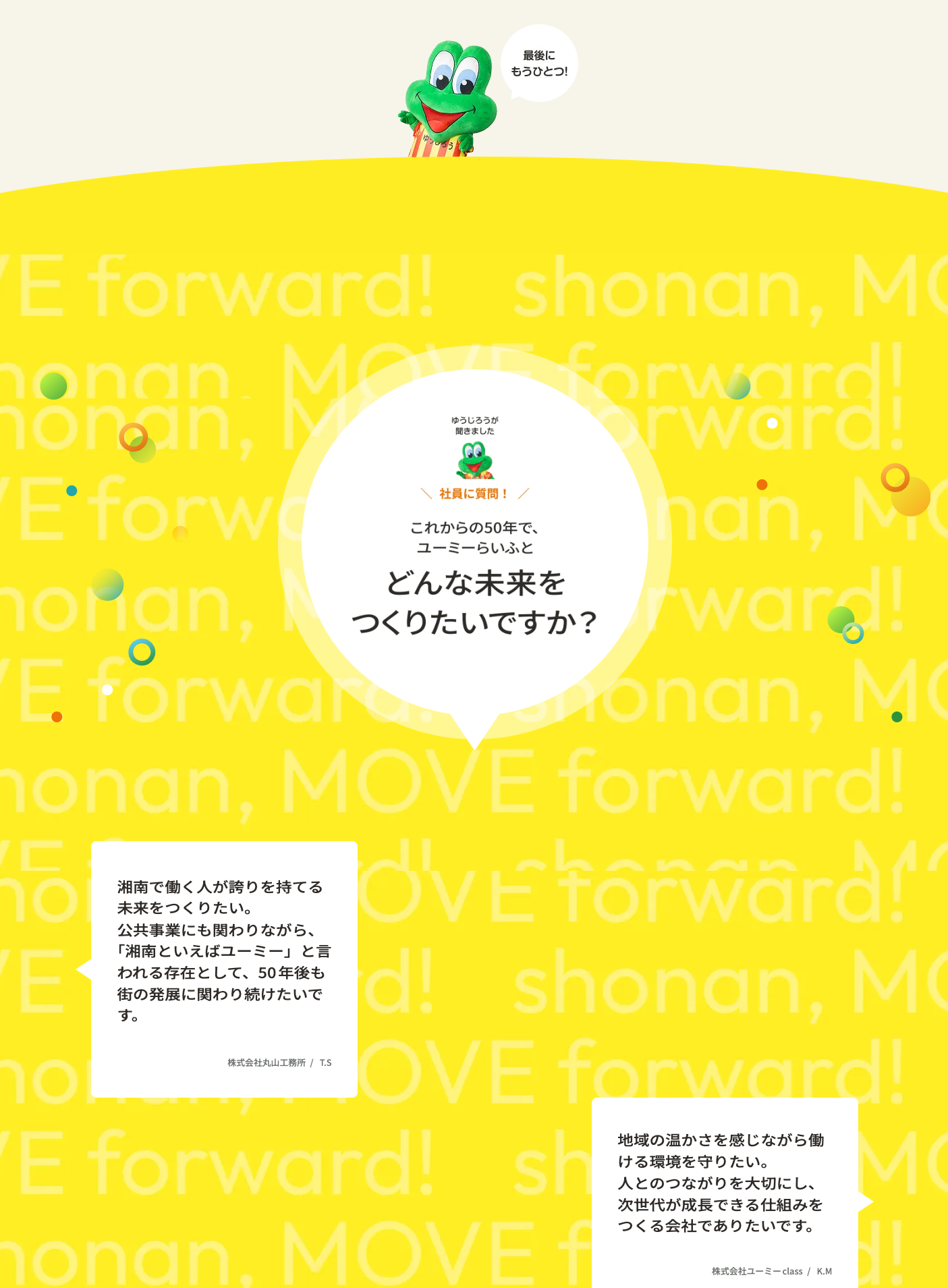 過去パートは「湘南物語」として、年表や出来事の羅列ではなく、地域とともに歩んできたストーリーとして情緒的な言葉遣いと重厚的なデザインで表現。キャラクター「ゆうじろう」に込められた哲学にも触れることで、社員の方々にとっても自社の価値観を再認識できるような、インナーブランディングの側面も持たせました。