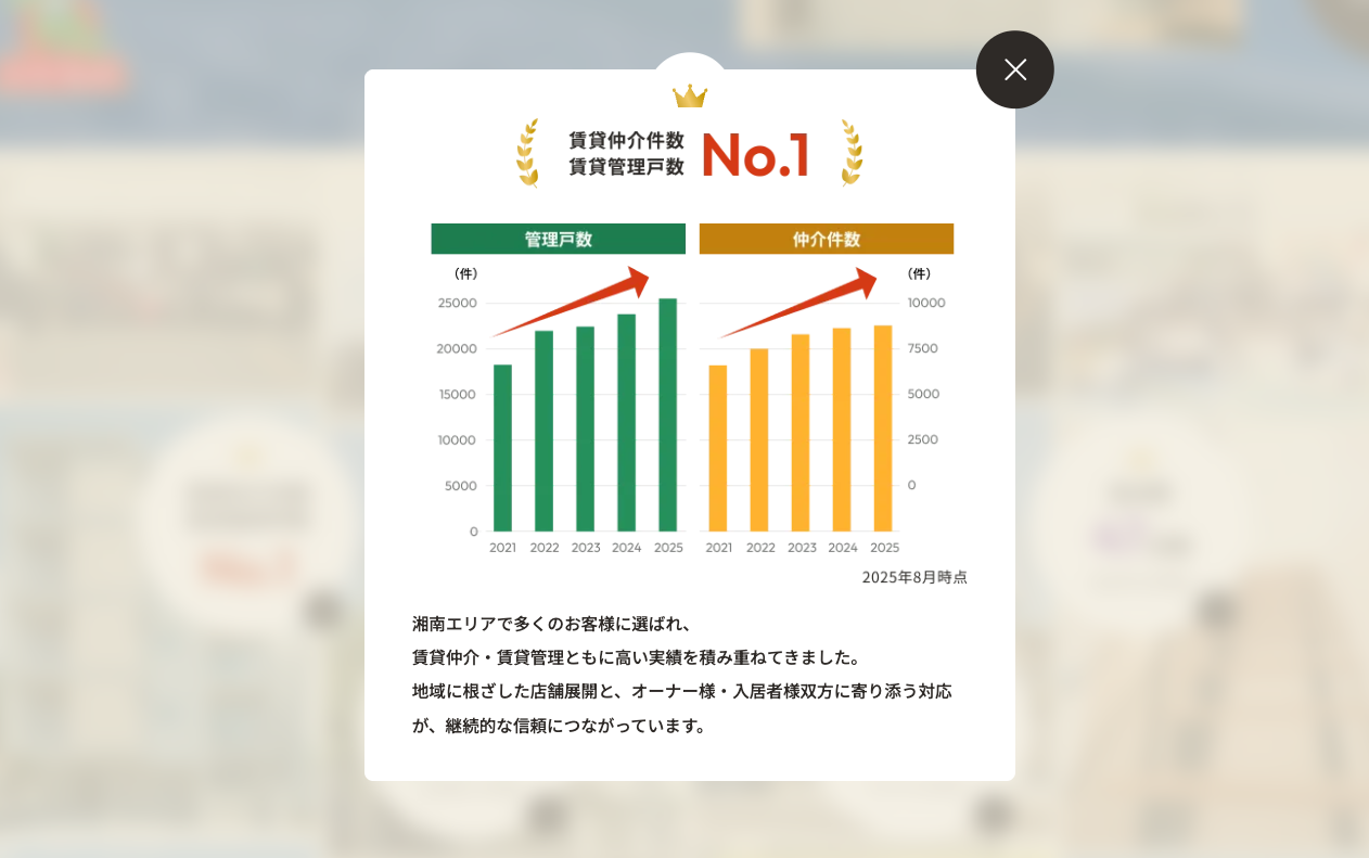 現在パートは、湘南エリアNo.1の賃貸管理戸数や賃貸仲介件数、高い入居率などを、図や数字を用いて視覚的に分かりやすく提示。たくさんの方々に支えられたこれまでの歩みがあったからこそ、これほど成長したという、信頼性の根拠となる、積み上げた確かな実績を伝えます。